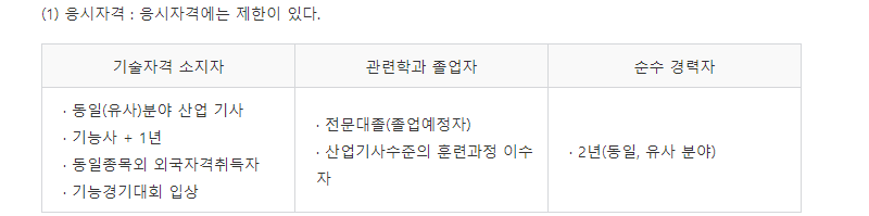 다른 산업기사를 가지고있거나, 4년제 대학교 2년 이상 수료, 전문대 졸업, 산업기사 난이도의 훈련과정 이수, 관련 경력 2년 보유자 등에 해당한다면 시험에 응시할 수 있습니다.