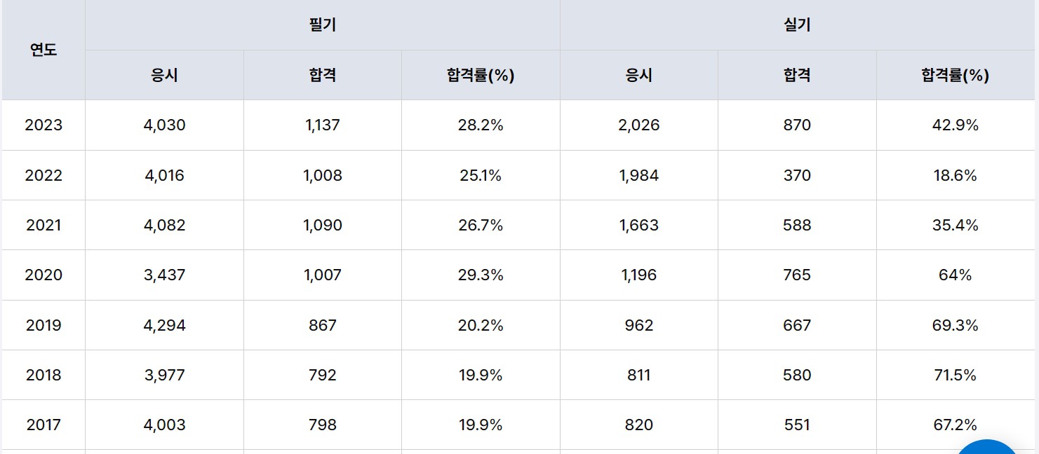 건축산업기사 필기시험 합격률은 27% 정도입니다. 30%를 넘기질 못하고있는만큼 난이도가 꽤 있는편이네요. 건축산업기사 실기시험 합격률은 평균이 무색하게, 편차가 매우 큰 경향을 보이고있습니다. 최저 18%에서 최고 71%까지 육박하오니, 합격률이 낮았던 시기의 문제를 꼼꼼하게 풀어보시고 실기시험에 대비하길바랍니다.