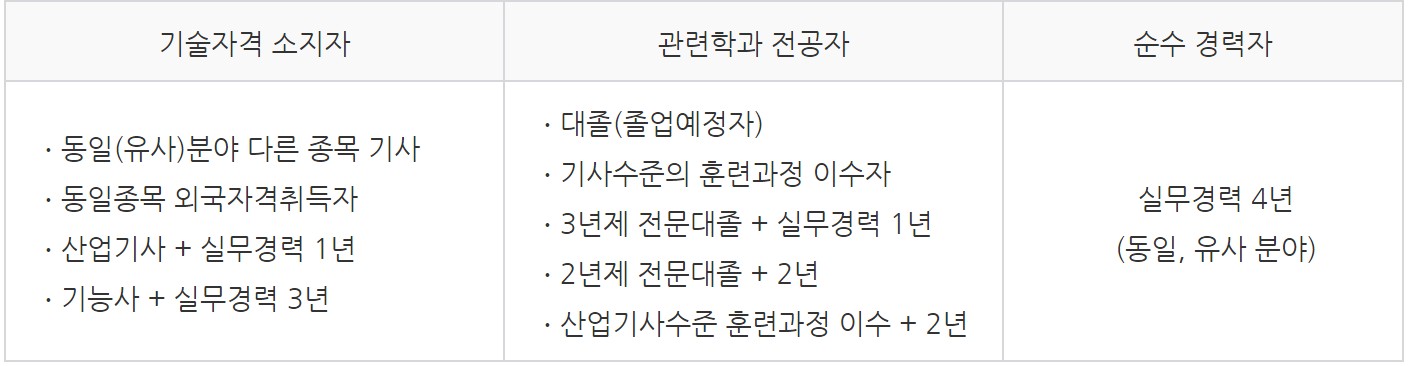 | 동일직무분야 | 경영, 회계, 사무 중 생산관리 건설, 광업자원, 기계, 재료, 화학, 섬유, 의복, 전기, 전자, 정보통신 식품가공, 인쇄, 목재, 가구, 공예, 농림어업, 환경, 에너지 분야 |