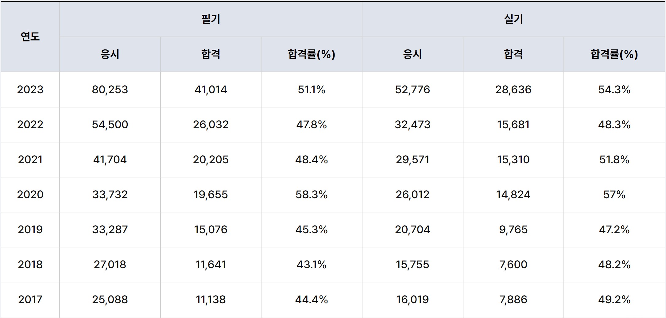 실기 합격률도 약 50% 내외이며, 편차는 크지 않습니다.