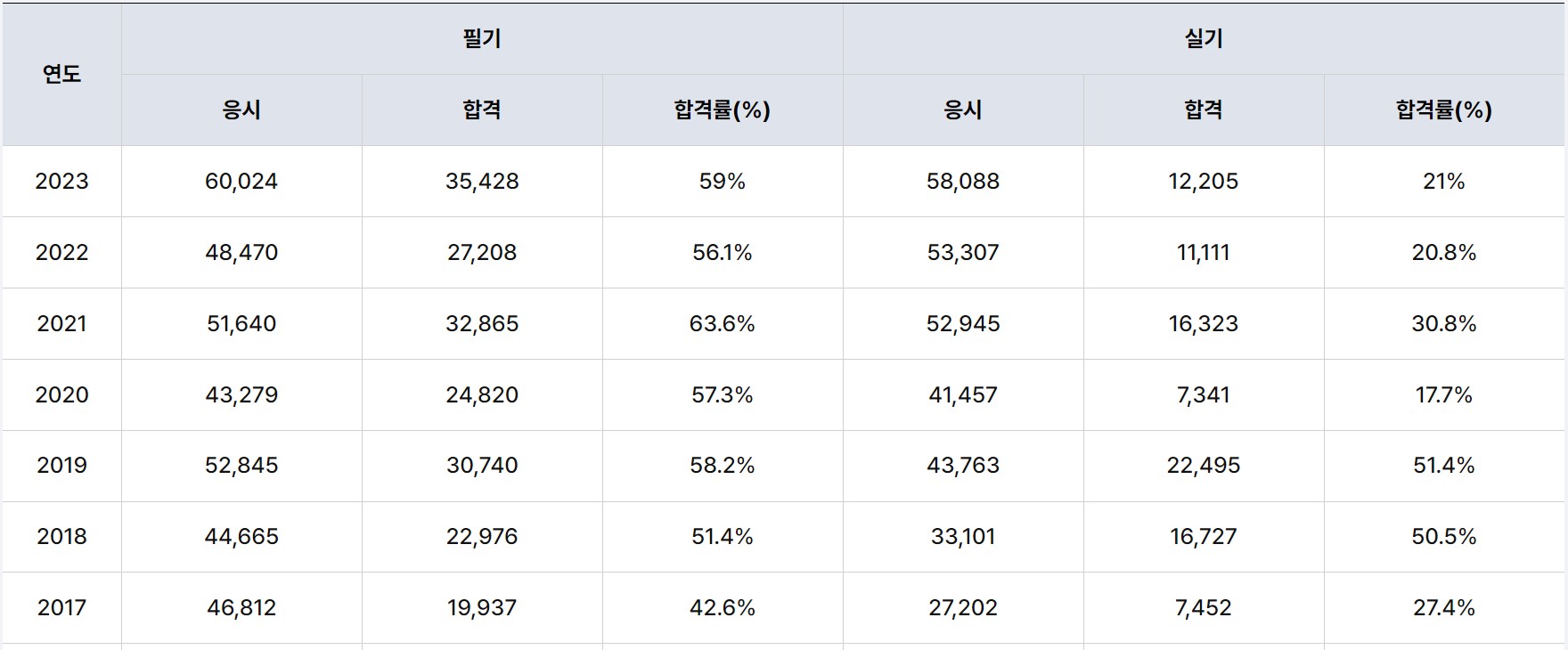 2017년부터 2023년까지의 합격률입니다. 전반적으로 필기시험은 약 50% 이상의 합격률을 보이지만, 실기시험은 편차가 크며, 2020년 개정 이후 합격률이 20%p 내외로 떨어진 모습을 보입니다. 물론, 이후에 기출문제가 많이 누적되었으므로 출제성향을 파악할 수 있으니, 잘 준비하여 한 번에 붙으시길 바랍니다.