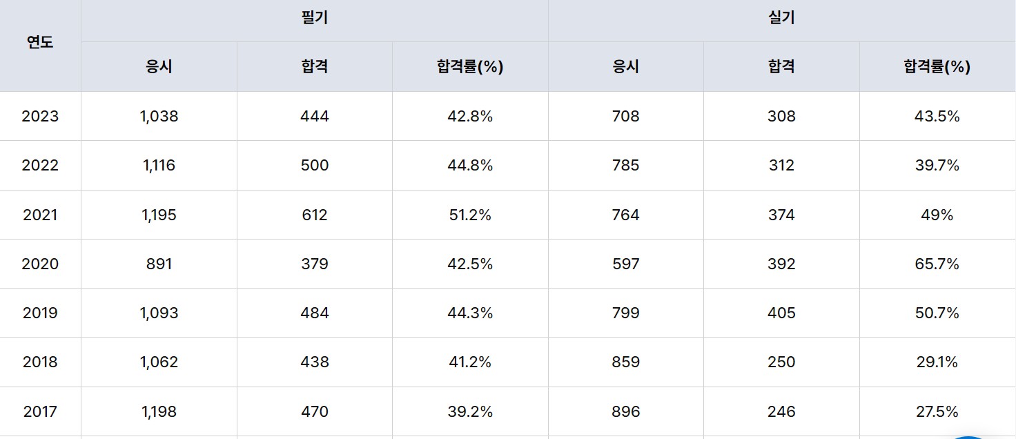 토양환경기사 필기시험 합격률은 약 43%정도의 평균을 이루고있습니다. 편차가 큰 편은 아니이므로, 어느정도 과년도 문제풀이를 어렵지 않게 해낼 수 있다면, 합격할 수 있을겁니다.