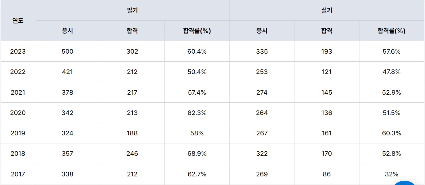 해양환경기사 실기시험 합격률은 55% 내외입니다. 편차가 간혹 있기때문에, 여러 과년도를 풀면서 빈출문제 외 킬러문항에 대해서도 잘 대비하시길바랍니다.